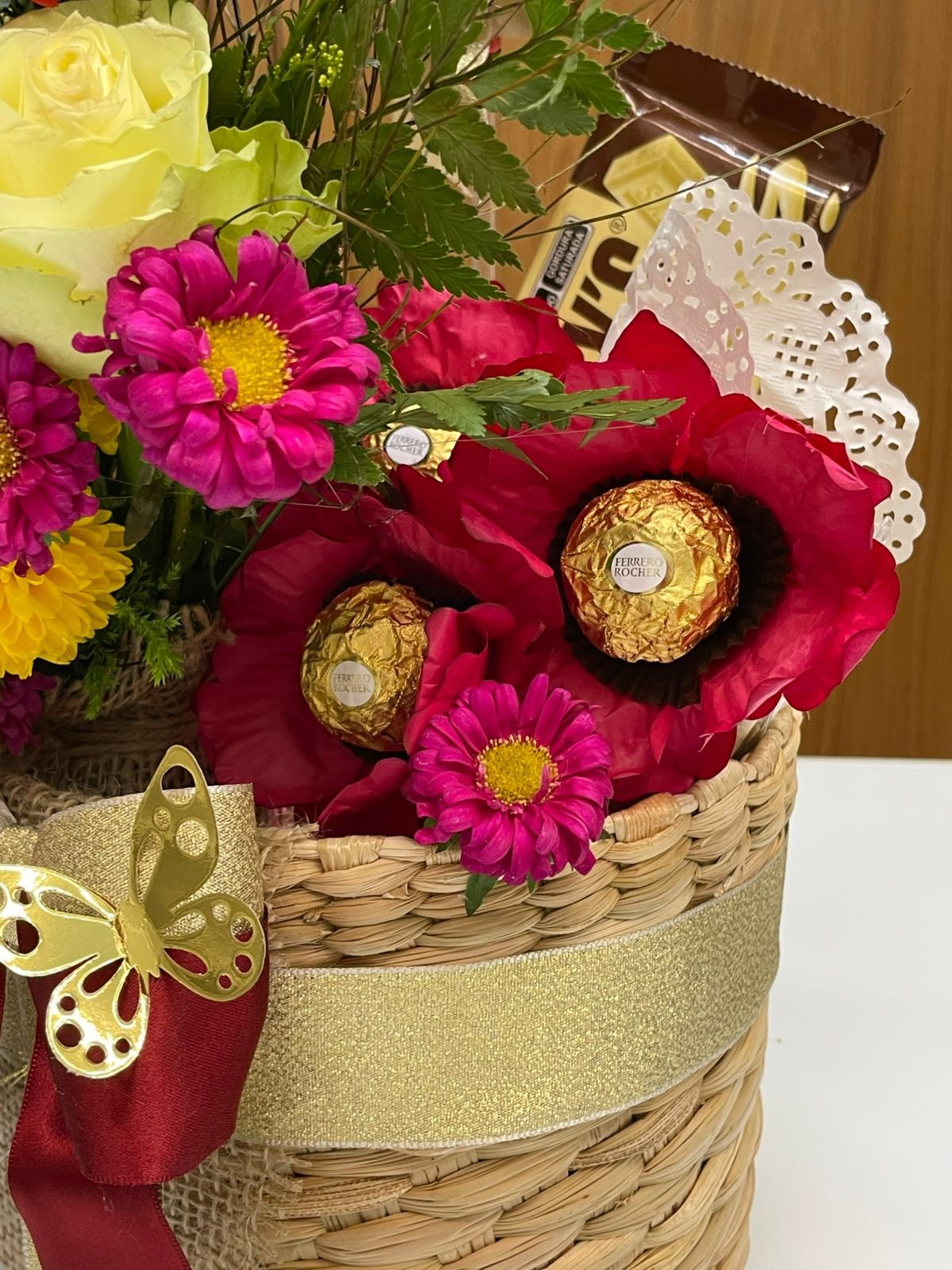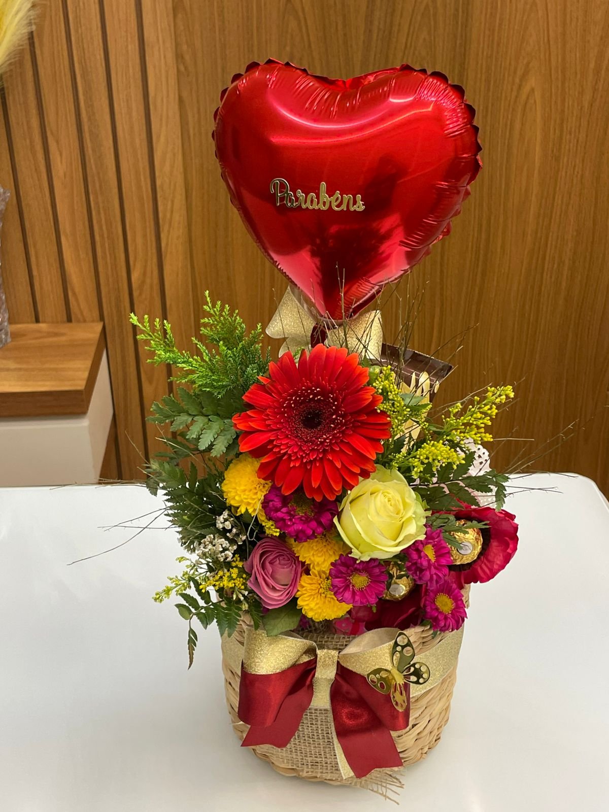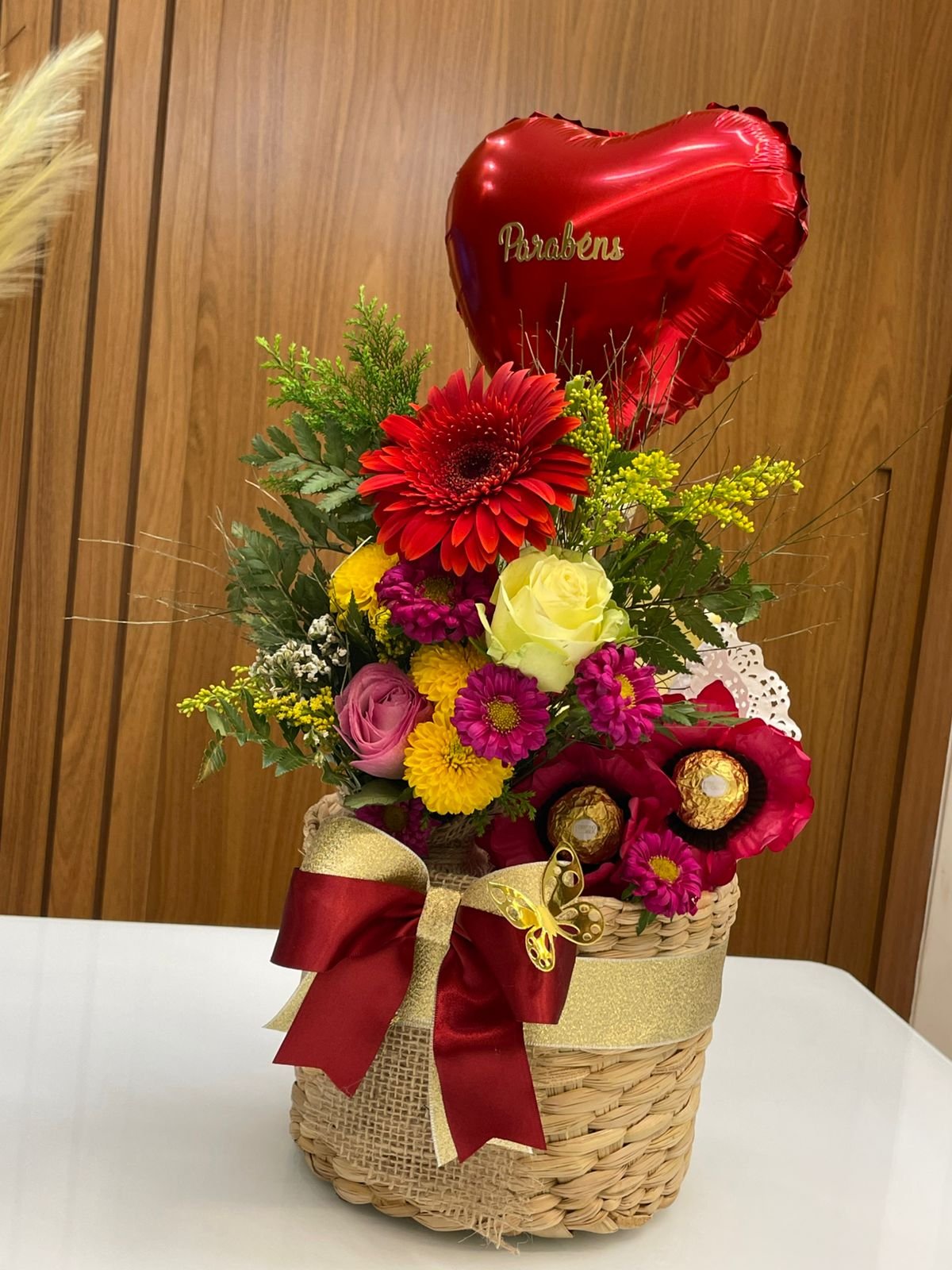Cachepô em palha de taboa Mini buquê de flores naturais Papelaria afetiva Balão de coração metalizado 1 Barra de chocolate 1 Barra de doce de leite 1 Trio Ferrero rocher 2 Kit kat