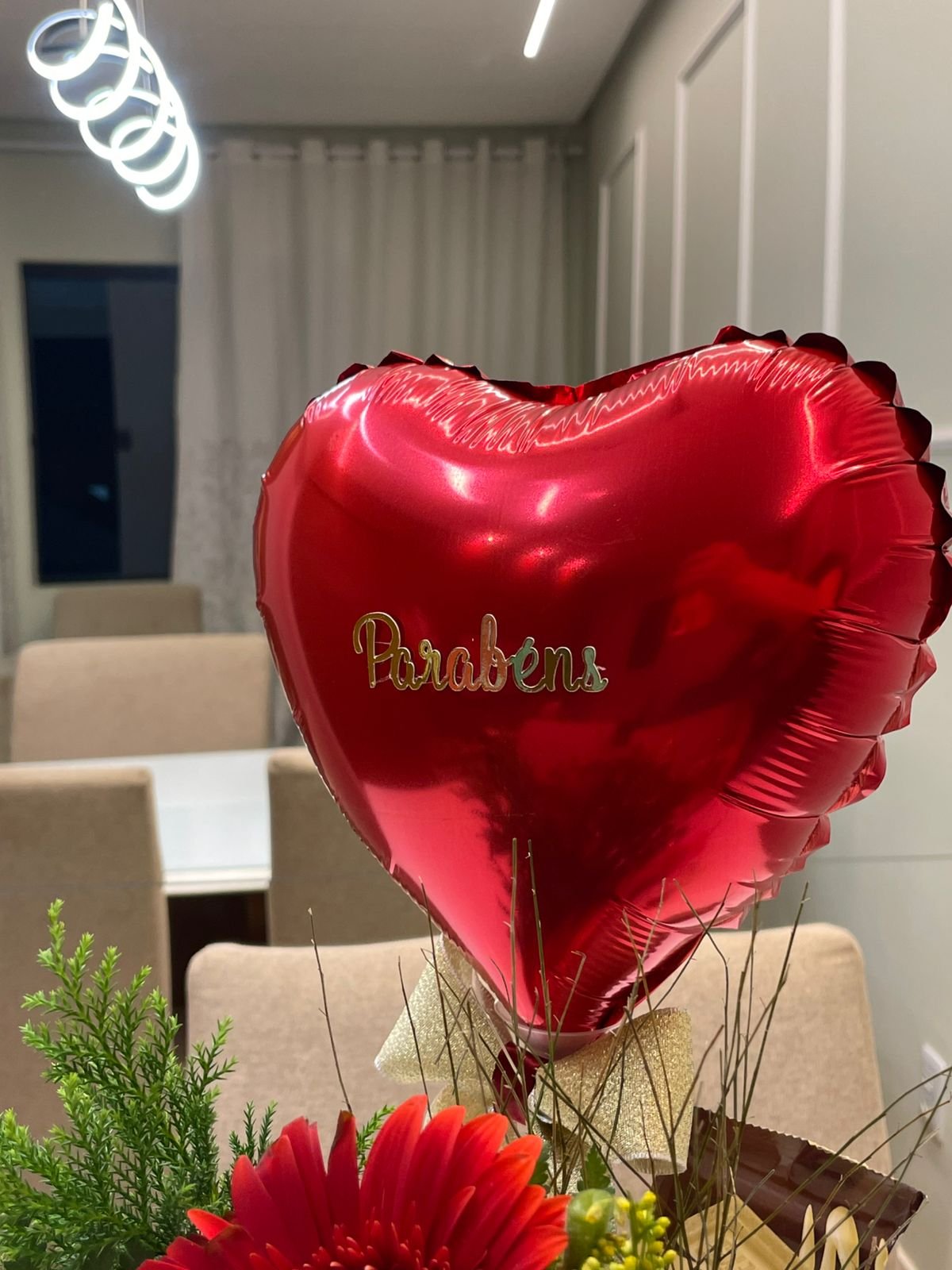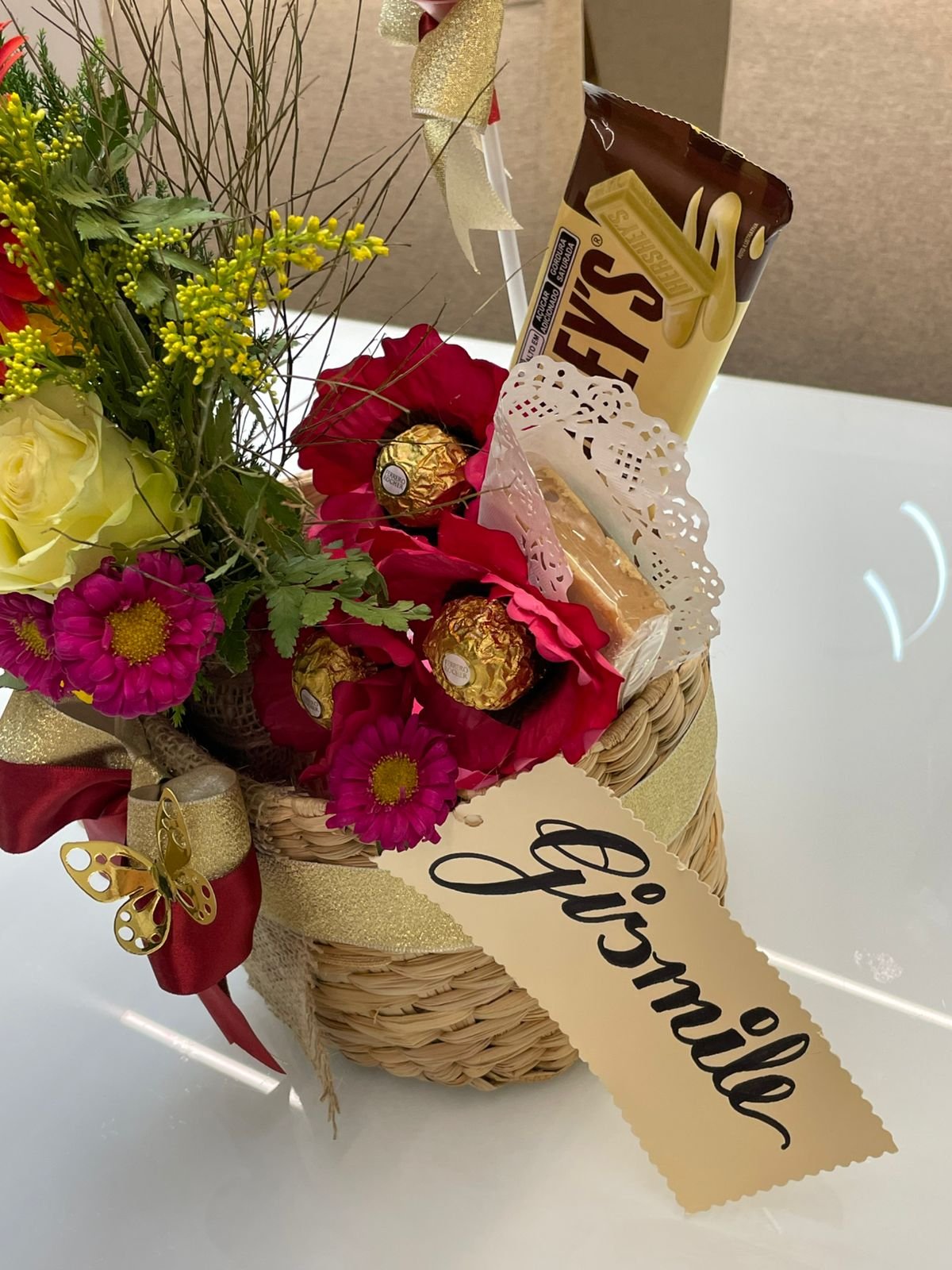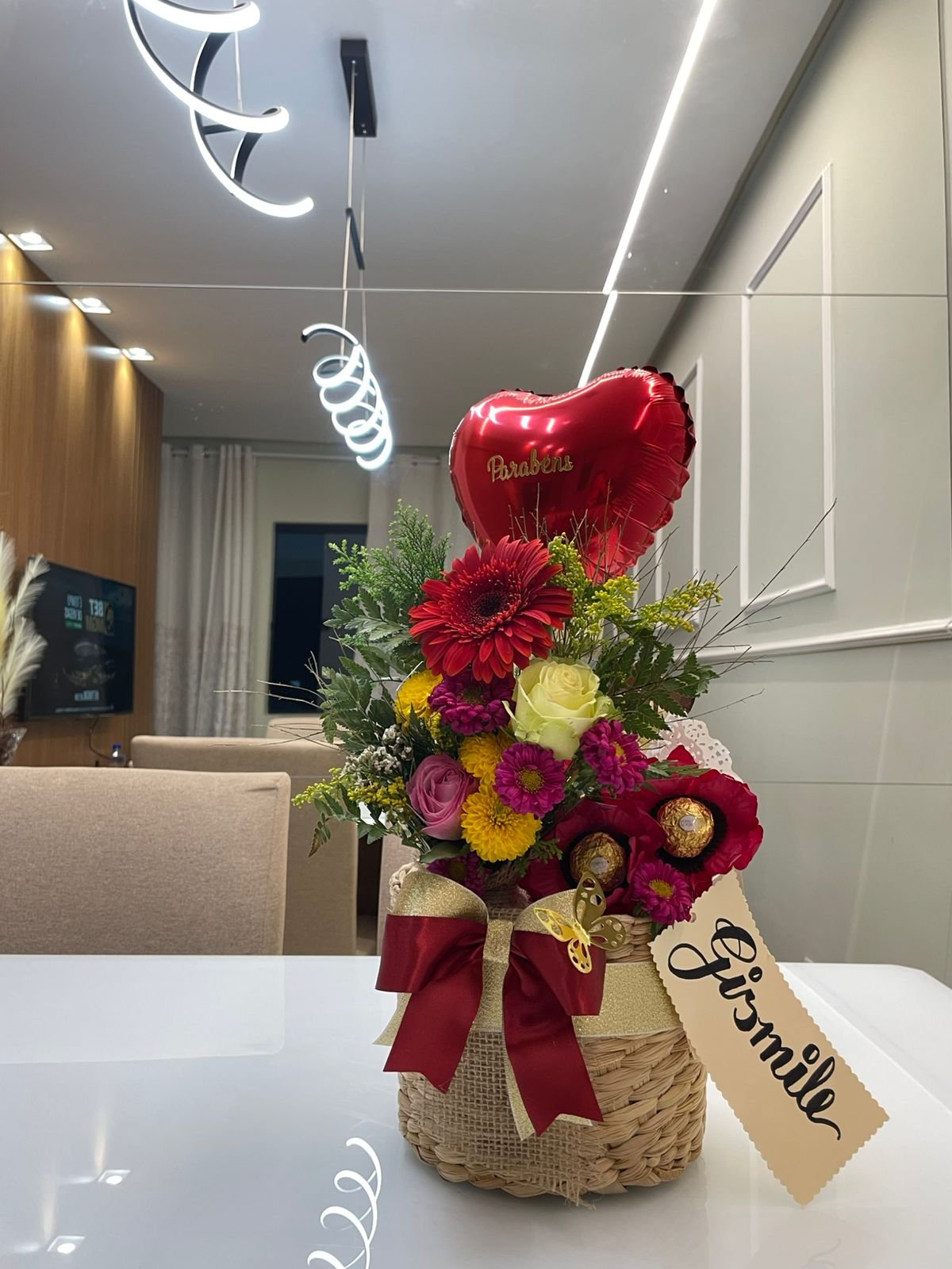 Cachepô em palha de taboa Mini buquê de flores naturais Papelaria afetiva Balão de coração metalizado 1 Barra de chocolate 1 Barra de doce de leite 1 Trio Ferrero rocher 2 Kit kat