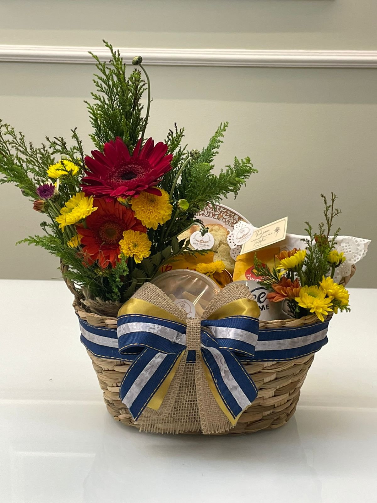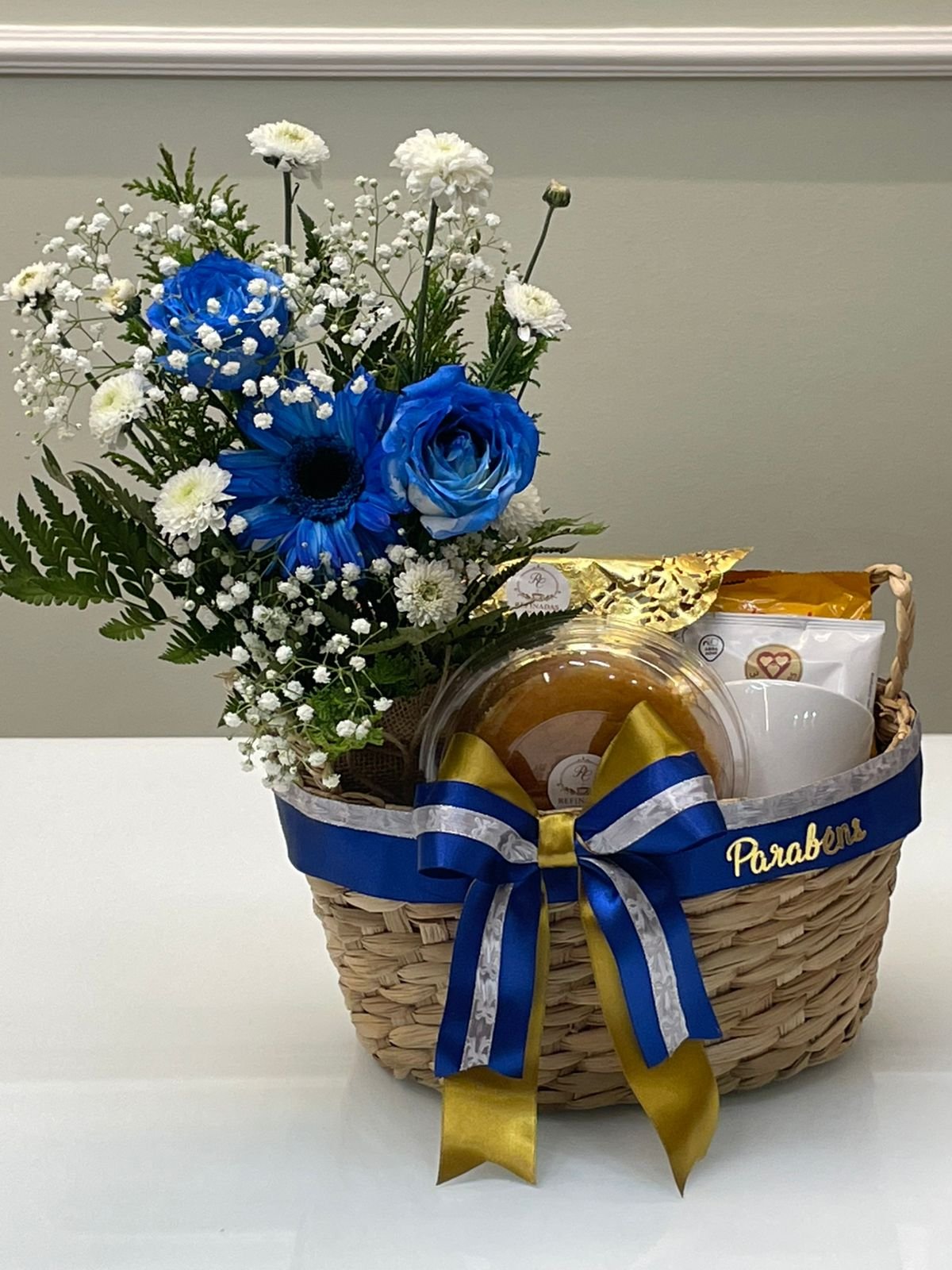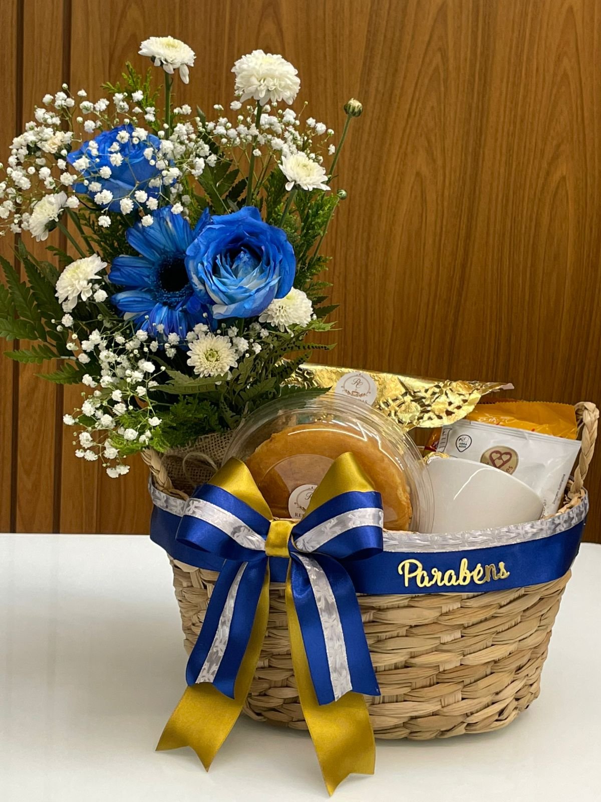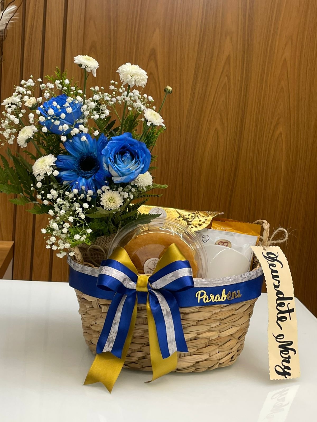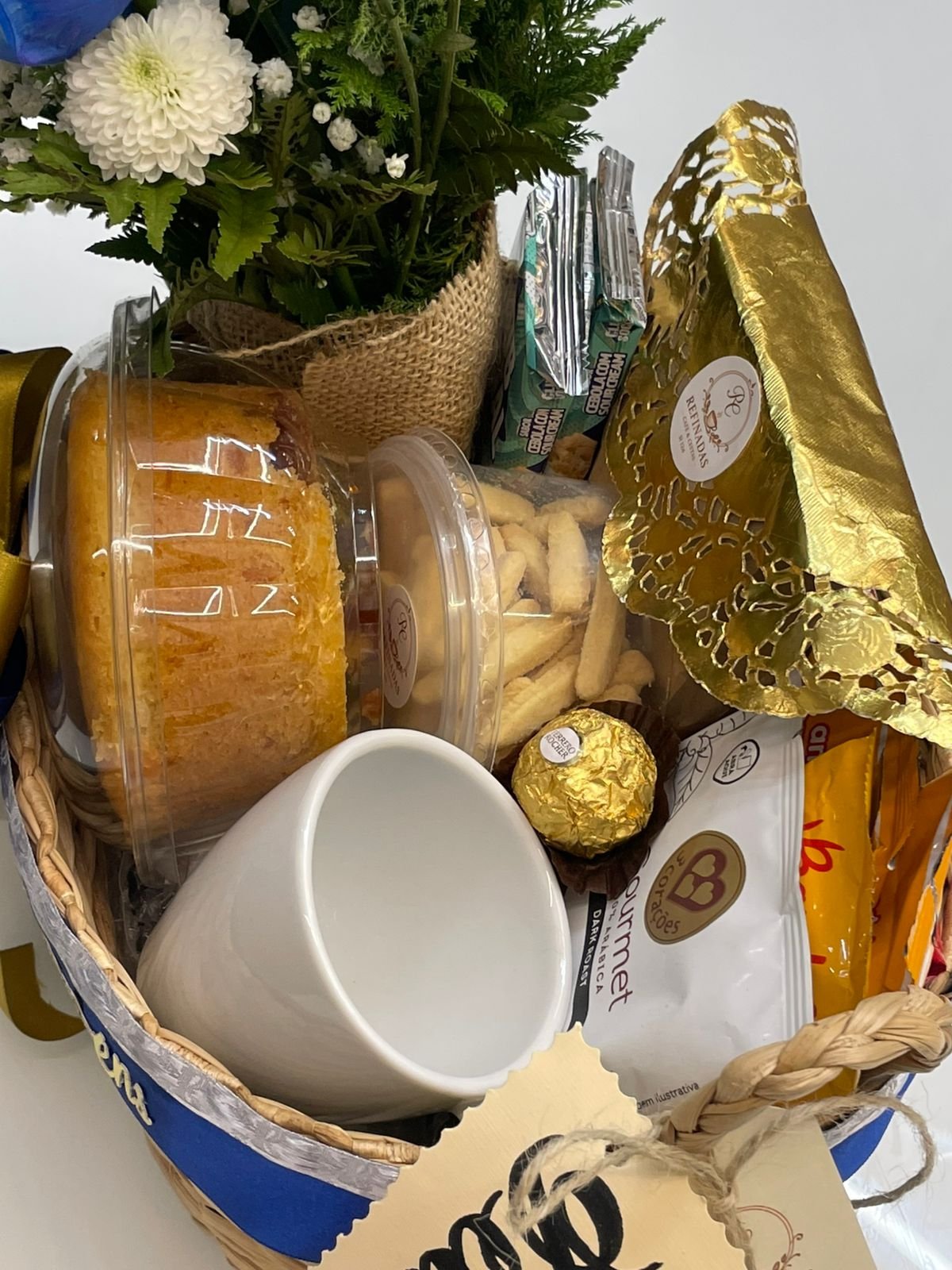 Cesta oval em palha de taboa – (uma peça elegante a ser usada como utilidades) Papelaria afetiva Arranjo em Flores naturais Mini Bolo artesanal ou Fatias de bolo em bandeja glamurosa Xicara Colher dourada Cookies Biscoito amanteigado Torradinhas Capuccino ou Drip Coffee Pão de mel Mini pacotes de amemdoim